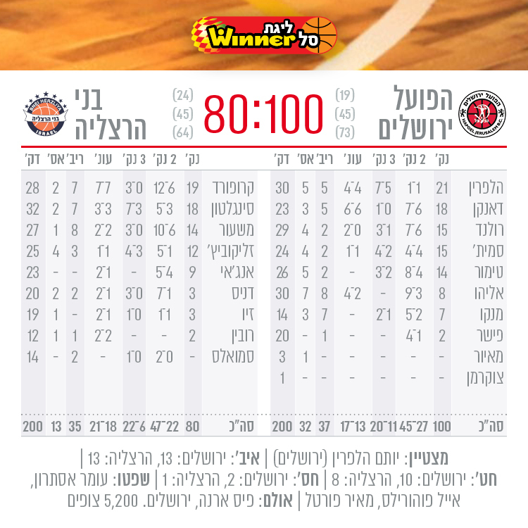 הרצליה בראשותם של ג'יימס סינגלטון ואבירם זליקוביץ' עוד עלתה לתשע הפרש בתחילת הרבע השני, אלא שאז שחקניו של דני פרנקו נכנסו לקצב. אי.ג'יי רולנד חימם את הידית, ג'וש דאנקן והלפרין סיפקו דקות טובות וגם בר טימור חזר לעצמו. כעבור 25 דקות היתרון של ירושלים כבר היה דו־ספרתי וברבע האחרון ירושלים כבר ברחה ל־27 הפרש בדרך לניצחון.