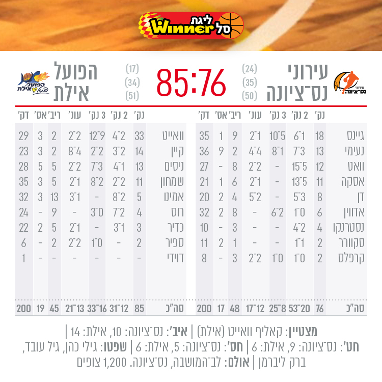 הצגת יחיד של קאליף וואייט, שקלע 33 נקודות (9 שלשות) סידרה לאילת ניצחון חוץ 76:85 בנס־ציונה והעלתה אותה למקום השמיני עם סיום הסיבוב השני.