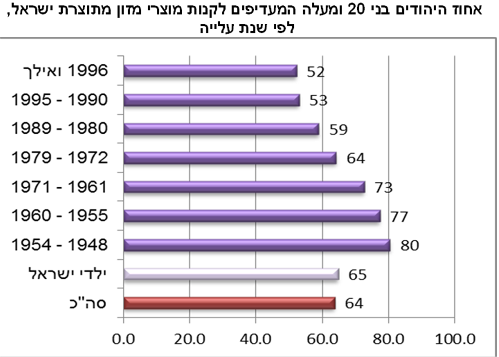 64%, כשני שליש, מעדיפים, כאמור, מוצרי מזון תוצרת הארץ. בקרב היהודים, 65% מילידי הארץ מעדיפים מזון תוצרת הארץ. בקרב העולים, ככל ששנת העלייה מאוחרת יותר, כך ההעדפה לתוצרת ישראלית פוחתת: בקרב אלה שעלו עד שנת 1971 יותר מ-70% מעדיפים תוצרת הארץ. לעומת זאת, בקרב אלה שעלו מ-1996 ואילך, 52% מעדיפים תוצרת הארץ.