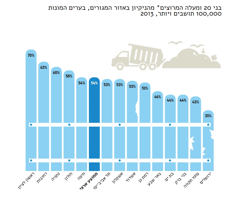רק 58% מהיהודים ו-35% מהערבים מרוצים מהניקיון באזור המגורים שלהם. כך עולה מנתונים שפרסמו בצהריים (יום ד') הלשכה המרכזית לסטטיסטיקה והמשרד להגנת הסביבה. מהנתונים עולה כי העיר שבה התושבים הכי מרוצים מהניקיון היא ראשון-לציון. בתחתית הרשימה, מבין הערים הגדולות, נמצאות פתח-תקווה וירושלים.