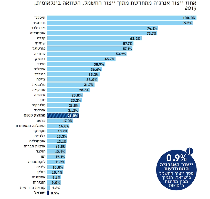 מהנתונים עולה כי ישראל נמצאת במקום האחרון בתחום זה. בגרמניה למשל, על-פי דו"ח הלמ"ס, 23.8% מייצור החשמל הוא מאנרגיות מתחדשות, בספרד 38.9%, בקנדה 63.2% ואילו באיסלנד 100%.