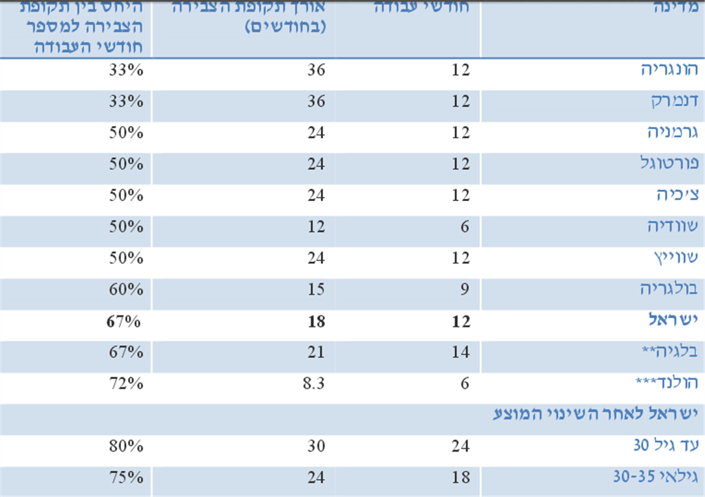 היחס בין מספר חודשי העבודה לאורך התקופה שבמהלכה נספרת תקופת הצבירה במדינות שונות: