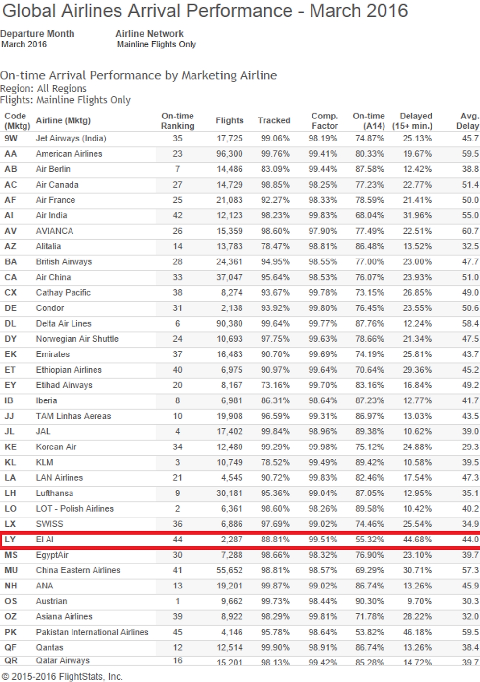 הנתונים של חברת Flystats, הנחשבת למובילה בתחום נתוני זמן אמת לחברות תעופה, מגלים כי בחודש מרץ התברגה חברת אל על למקום ה-43 מתוך 44 חברות סדירות מובילות בעולם בכל הקשור לדיוק מבצעי כאשר 44.68 אחוזים מטיסות החברה נחתו באיחור וזמן האיחור הממוצע עמד על כ-44 דקות.