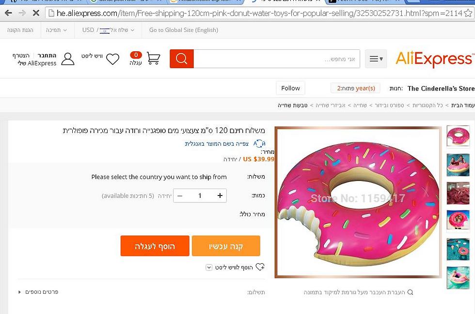 בחיפוש "Donut pool float" באיביי, בתספת המלה gigantic או giant, מצאנו באיביי מוצר שנראה זהה ב-78.02 שקל. המשלוח לישראל - חינם. מצאנו באתר גם מחירים נוספים, בין היתר 44.70 שקל. בעמוד הזה יש הצעות של מוכרים ב-10.89-130 שקל