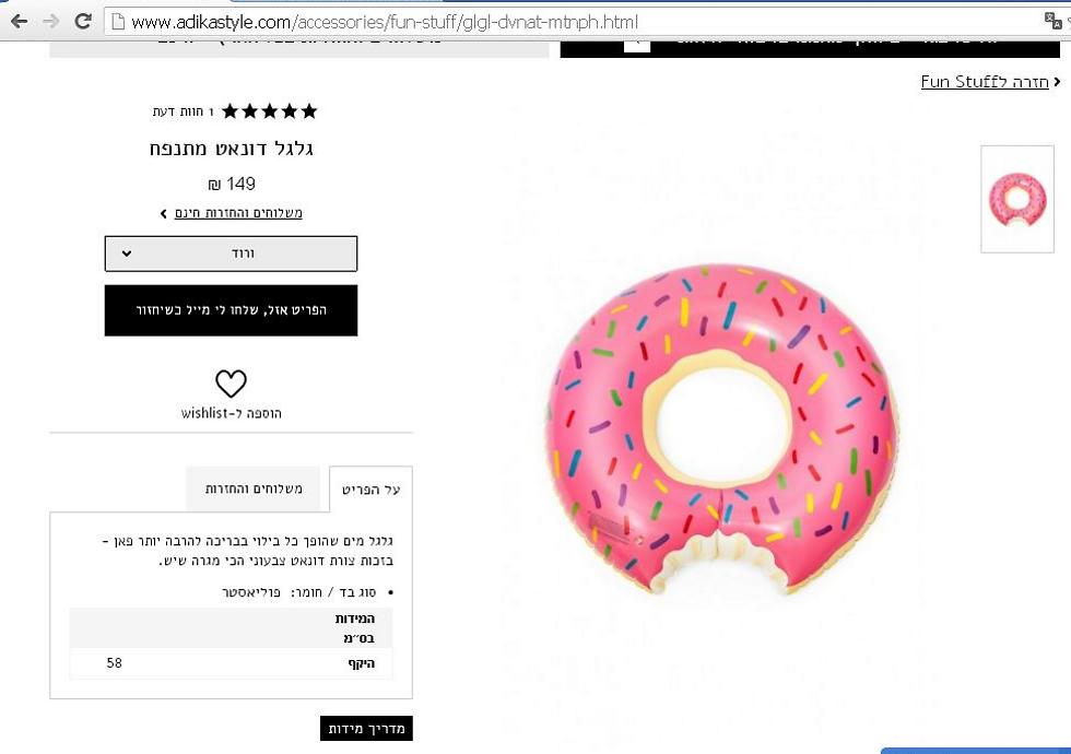 היתכן שזה בגלל גודל שונה? לא. היקף גלגל דונאט מתנפח בעדיקה, לפי אתר האינטרנט הישראלי: 58 ס"מ. רוב גלגלי הדונאט המתנפחים שאנחנו מצאנו הם בהיקף של 120-90 ס"מ. כלומר לכאורה מדובר בגלגלים גדולים יותר וזולים יותר מהגלגל שנמכר באתר הישראלי.