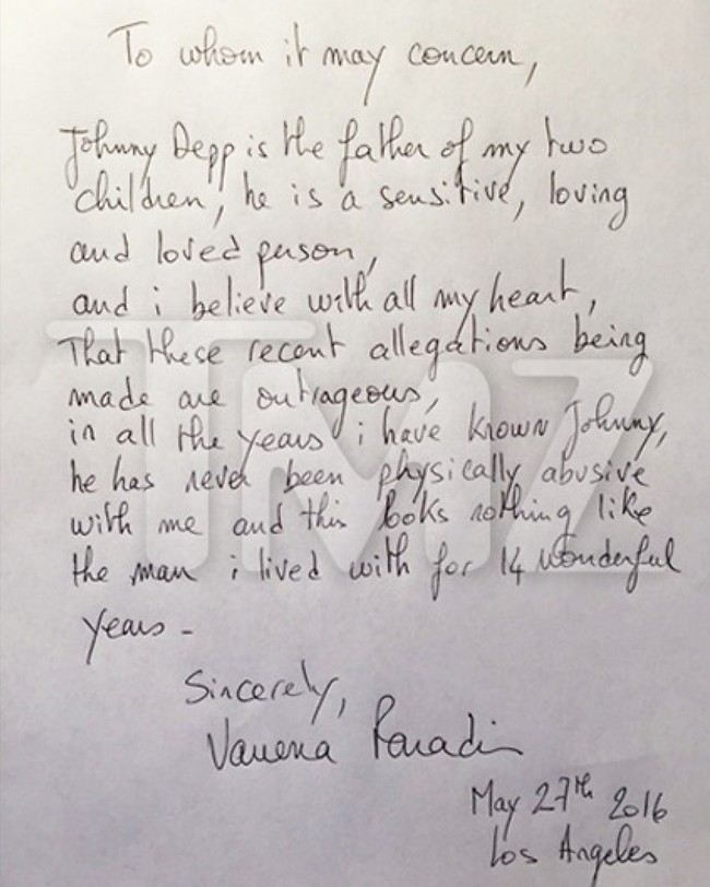 אבל יש גם מי שעומדת לצדו. אתר TMZ מדווח כי אשתו לשעבר של השחקן ואם שני ילדיו, ונסה פאראדי, בזה לטענותיה של הרד ומתעקשת כי "ג'וני הוא אדם אוהב שמעולם לא התעלל פיזית בנשים" ומכנה את טענותיה של הרד "שערוריה" ומוסיפה: "בכל שנות נישואינו הכרתי את ג'וני, הוא מעולם לא התעלל בי פיזית וההתנהגות הזו לא מתארת כלל את האדם עמו חייתי במשך 14 שנים נפלאות".