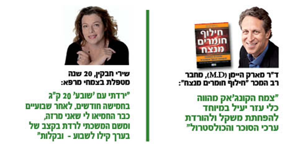 ד"ר מארק היימן (M.D), מחבר רב המכר "חילוף חומרים מנצח": "צמח הקונג'אק מהווה כלי עזר יעיל במיוחד להפחתת משקל ולהורדת ערכי הסוכר והכולסטרול". שירי חבקין, 20 שנה מטפלת בצמחי מרפא: "ירדתי עם 'שובע' 15 ק"ג בחמישה חודשים. לאחר שבועיים כבר החמיאו לי שאני מרזה, ומשם המשכתי לרדת בקצב של בערך קילו לשבוע - ובקלות".