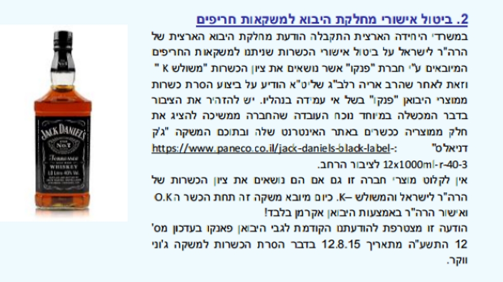 "יש להזהיר את הציבור בדבר המכשלה, במיוחד נוכח העובדה שהחברה ממשיכה להציג את חלק ממוצריה ככשרים באתר האינטרנט שלה ובתוכם המשקה "ג'ק https://www.paneco.co.il/jack-daniels-black-label-: "דניאלס .הרחב לציבור 12x1000ml-r-40-3 . אין לקלוט מוצרי חברה זו גם אם הם נושאים את ציון הכשרות של הרה"ר לישראל והמשולש –K .כיום מיובא משקה זה תחת הכשר ה-O.K ואישור הרה"ר באמצעות היבואן אקרמן בלבד!