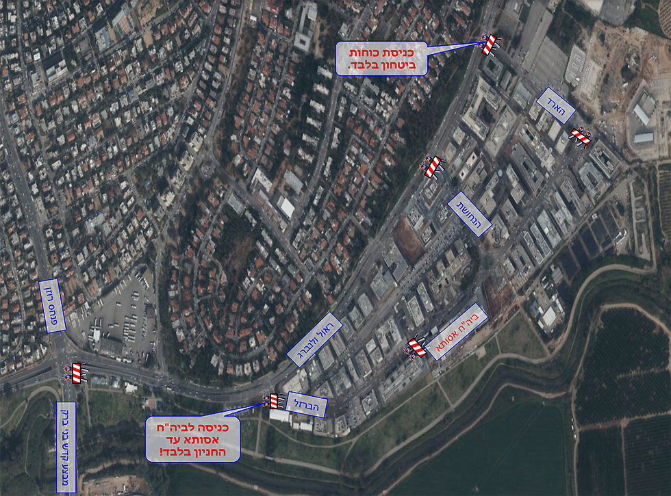 רחוב הברזל - חסום לתנועה. מתאפשרת כניסה לבית החולים אסותא בלבד. יציאה מחניון בית חולים אסותא מתאפשרת בניגוד לכיוון התנועה לכיוון כיבוי אש.