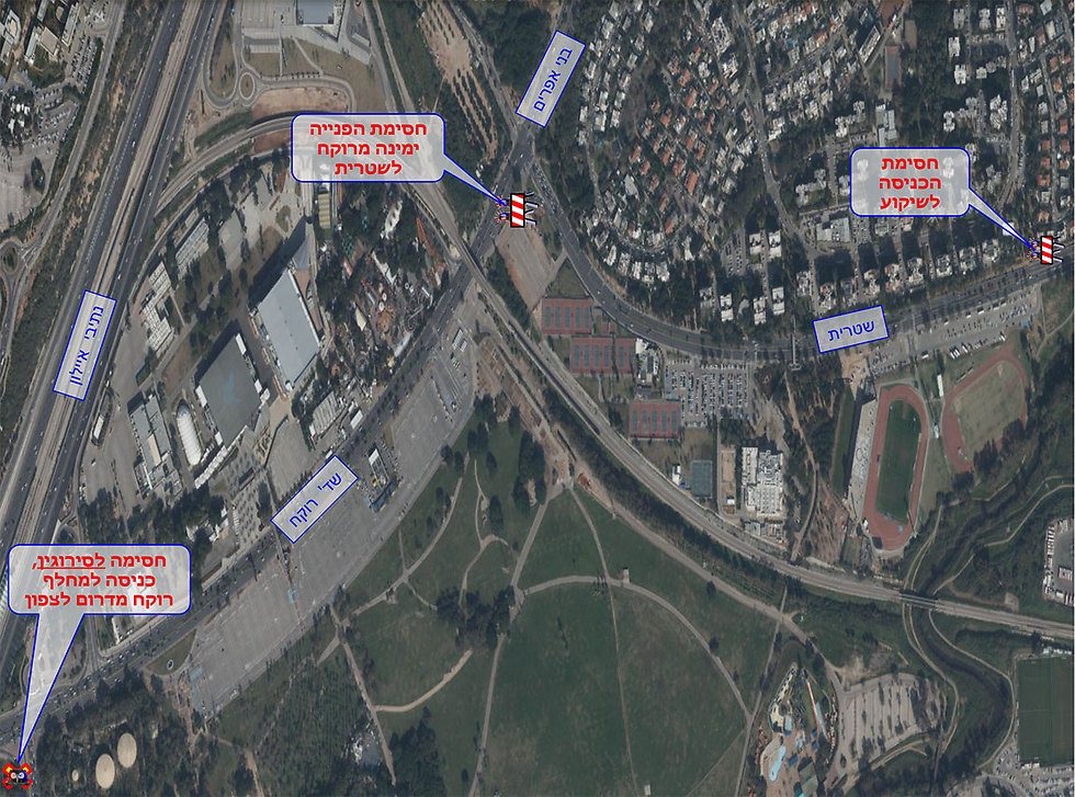 רחוב שטרית - הכניסות לשיקוע ומעל השיקוע בצומת לכיוון ראול ולנברג למערב חסומות. התנועה בצומת אפשרית לכיוון פנחס רוזן תל אביב לכיוון צפון ולרחוב מבצע קדש בני ברק לכיוון דרום בלבד.
