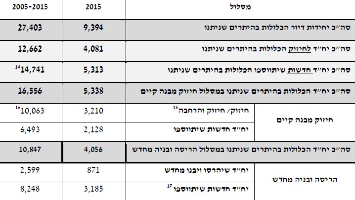 עוד עולה מהנתונים של מינהל התכנון כי מאז מועד אישור תמ"א 38 על ידי הממשלה במאי 2005 ועד לשנת 2016, ניתנו בסך הכול היתרי בנייה ל-27,400 יחידות דיור - מתוכן 14,700 דירות חדשות שיתווספו ו-12,700 דירות קיימות שיחוזקו וישודרגו.
