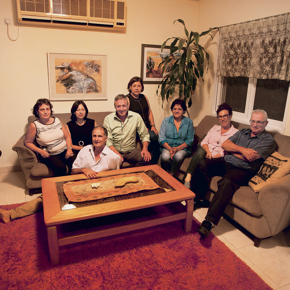 הם כולם כבר בני 58. צור חרס נמצא במרכז העניינים, מימינו מירה אופיר, טובה ישראל וירון ארנהיים. משמאלו אירית להב, אלי פלג, תמי גרינברג, סמדר אביב וירדנה יהודאי.