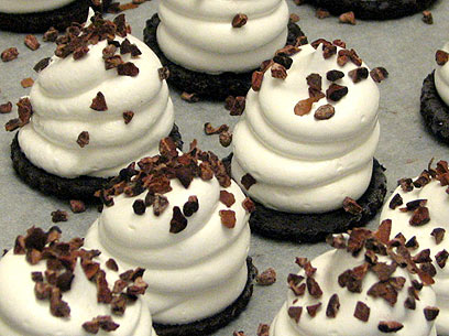- מוצאים את העוגיות מהמקפיא, מזלפים מעל את קציפת הקרמבו, ומחזירים למקפיא למשך שעתיים.