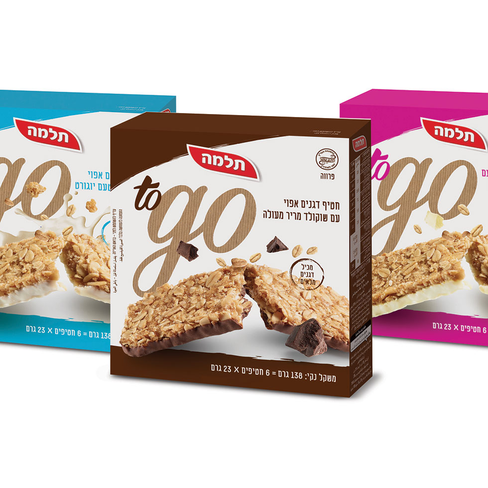 תלמה משיקה את תלמה to go, סדרת חטיפי דגנים אפויים למבוגרים ב-3 טעמים: שוקולד מריר, שוקולד לבן וקרם בטעם יוגורט. כל המוצרים מכילים דגנים מלאים, הינם אפויים וכל חטיף מכיל 36% שיבולת שועל. המחיר - החל מ-9.70 שקל.