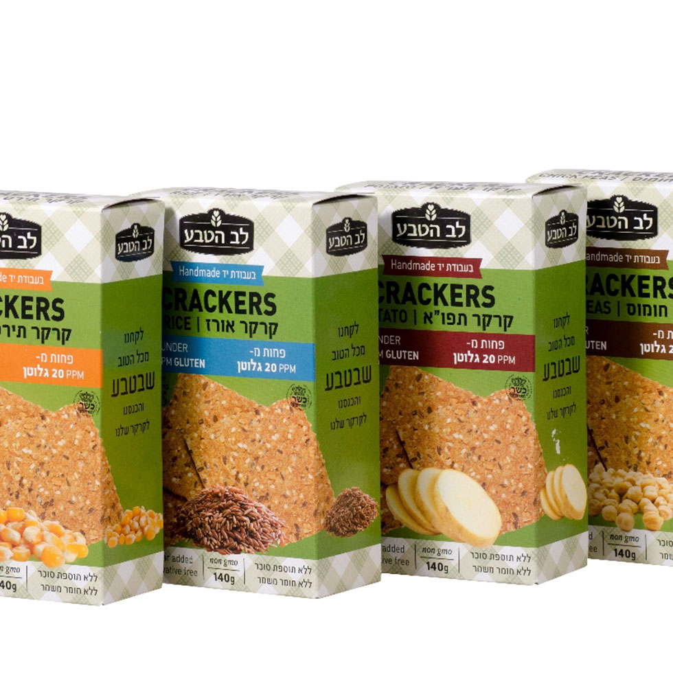 לב הטבע משיק קרקרים העשויים מקמח חומוס, תירס ותפו"א המיוחד לשומרי גלוטן. בסדרה הבסיס לקרקר הינו מקמח אורז מלא, זרעי חמניה, זרעי פשתן, זרעי שומשום ומעט קצח. מחיר 17 שקל לחבילה.