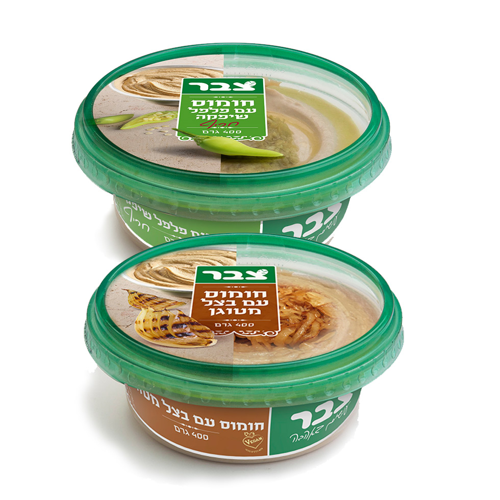 סלטי צבר משיקים 2 סלטים חדשים: חומוס עם בצל מטוגן וחומוס עם פלפל שיפקה. המחירים - בין 10.90 ל-11.90 שקל ל-400 גרם.