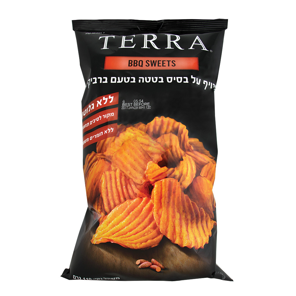 חברת דנשר משיקה טעם חדש בסדרת חטיפי TERRA CHIPS - חטיף צ'יפס ללא גלוטן על בסיס בטטה, בטעם ברביקיו. המחיר לאריזת 110 גרם כ-16שקל.