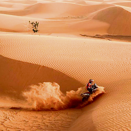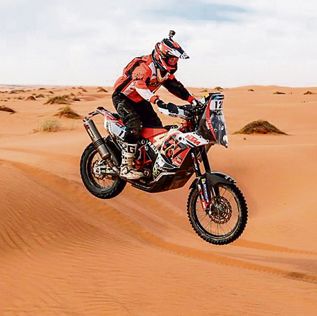 כבר את היום הראשון הוא סיים כמוביל, "אבל זה מרוץ ארוך, אז אמרתי לעצמי שזה לא אומר כלום, ונראה מה קורה ביום הבא, שבו חיכו לי 400 ק"מ בשטח. הניווט הוא אתגר רציני. אנחנו לא רוכבים עם איזה ווייז ומסך שמראה לנו מתי לפנות, אלא עם ספר דרך מיושן בכוונה, שמספק רק הוראות כמו פנייה שמאלה בעוד 20 ק"מ. אתה רוכב בדיונות, במדבר, המסלול לא ממש מסומן בשטח, ואתה כל הזמן חייב להזדהות ולמקם את עצמך תוך כדי רכיבה במהירויות שיכולות להגיע ל־175 קמ"ש.