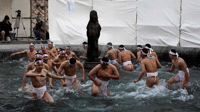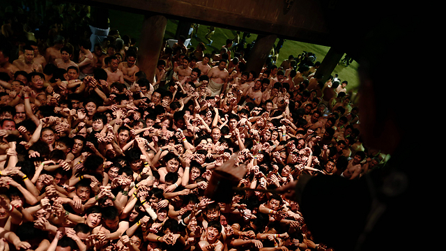 עם חתיכת בד קטנה שמכסה את חלציהם, אלפי גברים התמודדו בגבורה עם טמפרטורות מקפיאות ונלחמו לתפוס קמעות - אלות שמביאות מזל - שהשליך לעברם כומר, במסגרת פסטיבל הגברים הערומים השנתי ביפן.
