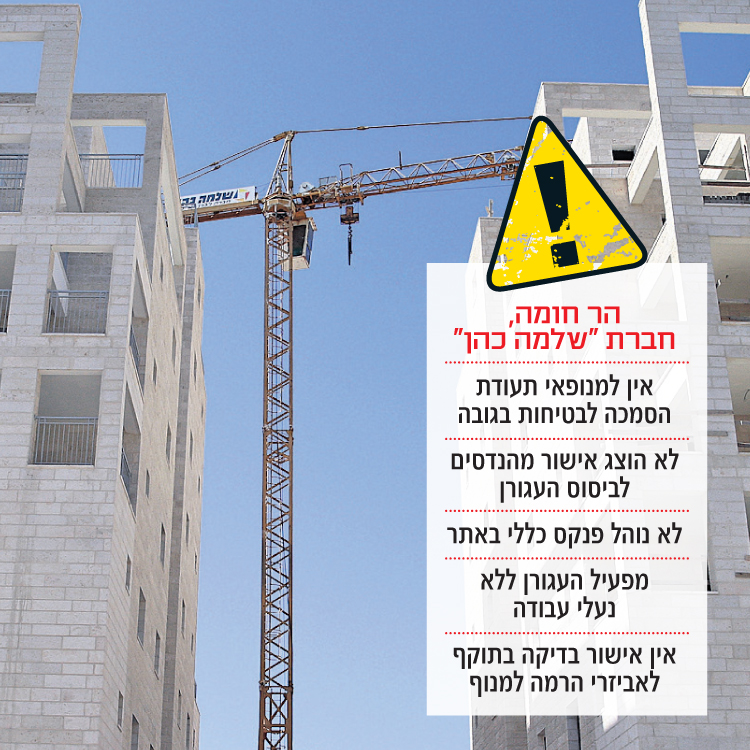באתר של חברת "די.סי.", המקימה בהר חומה עשרות יחידות דיור, פועלים שני מנופים. ליקויים לא חסרו: לא נמצא במקום מנהל עבודה מוסמך, והמנוף הניף דוד ברזל ללא כיוון וללא מעניבן, מי שאמור לקשור את השלשלאות למנוף ולדוד. מהנדס ביצוע, שניהל בפועל את הפרויקט בעת הבדיקה, אמר: "אני לא חתום על האתר, לא רוצה אחריות על הראש".