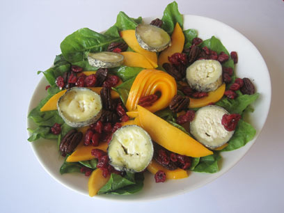 - מניחים בקערה את עלי הבייבי, הנענע, החמוציות ופלחי המנגו, ויוצקים מעל את הרוטב. מפזרים את הפקאן הסיני מעל לקישוט, ומניחים את הגבינה. מתבלים עם פלפל ומלח.