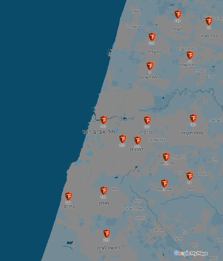 העיר המובילה היא תל אביב עם 793 פרויקטים ומיד אחריה רמת גן עם 769. אחריהן ניתן למצוא את הרצליה ואשדוד עם 218 ו-217 פרויקטים בהתאמה. ראשון לציון עם 205 פרויקטים, גבעתיים עם 202, חולון - 186, פתח תקווה - 180 ובת ים - 144.