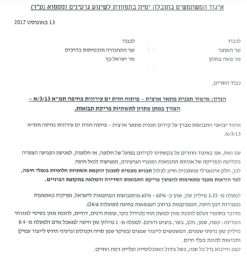 במכתב שנשלח לשרי האוצר והתחבורה מטעם ארגון מייבאי התבואות בירכו על היוזמה אך סייגו בכך ש"אנו באיגוד חוזרים על בקשתינו לקידום בפועל של חלופה, או חלופות, לפגיעה הצפויה בקליטה ובפריקה של אוניות התבואות ומוצרי הגרעינים, המגיעות לנמל חיפה. חלק אינטגרלי מהתכנית חייב לכלול תכנית מעשית לתכנון והקמת תשתיות חלופיות בנמלי חיפה, לצד הוראות מעבר מתאימות להמשך פריקת התבואות הסדירה והמלאה בתקופת הביניים".