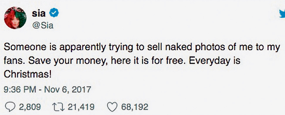 הזמרת המסתורית העלתה שלשום לרשתות החברתיות צילום של ישבנה החשוף, עליו הייתה חותמת watermark של סוכנות צילומים ומתחתיו כתוב: “אם תקנו את התמונה הזו, תקבלו עוד 14 צילומים”. התגובה של הזמרת שהייתה מועמדת לשמונה פרסי גראמי: “מישהו מנסה למכור צילומי עירום שלי למעריצים. תחסכו את הכסף, הנה זה בחינם. כל יום הוא חג מולד”. במקרה — או כמובן שלא — האלבום החדש של סיה שייצא החודש ייקרא “כל יום הוא חג המולד”.