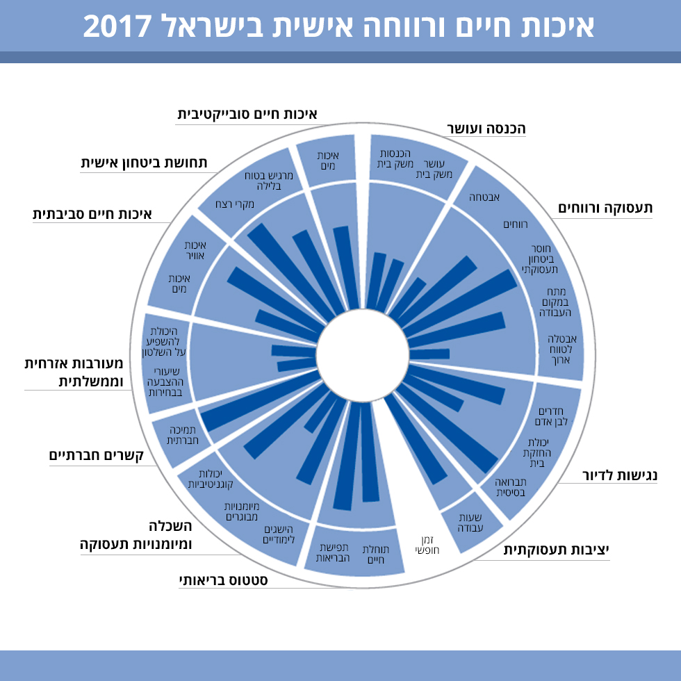 דו"ח איכות החיים והרווחה האישית (Well Being) של ה-OECD מצייר תמונה מעורבת בנוגע לישראל. המדדים מחלקים את ציוני המדינות לשלוש דרגות - הדרגה העליונה הטובה ביותר, הדרגה האמצעית והדרגה התחתונה ביותר. בעוד שבמרבית הפרמטרים מצטיינות ארה"ב, קנדה ונורבגיה, עם ציונים מהדרגה העליונה במרבית התחומים, ישראל מקבלת את הציונים מהדרגה השלישית והנמוכה במספר לא מבוטל מהתחומים.