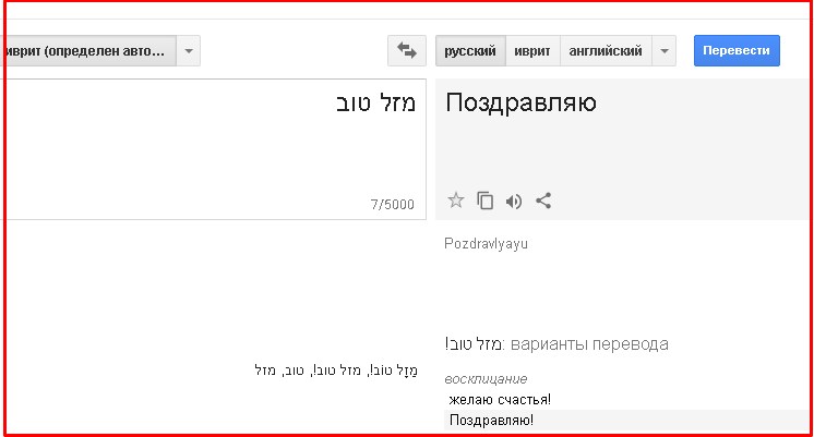 Зато с другим традиционным поздравлением - "мазаль тов" - проблем у Google-переводчика не возникает. В данном случае не предлагаются ни Рамадан, ни Святая Троица, ни День благодарения - а лишь "поздравляю".