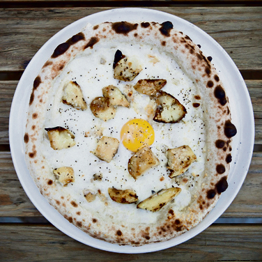 פיצה ביצת עין // חוץ מהבצק והביצה, כוללת הפיצה הזאת תפוח אדמה מדורה, מוצרלה ופקורינו.