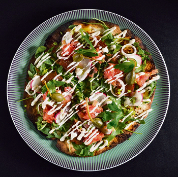 פיצת טלה מעושן // בצק בזיליקום, חמאת קשיו, דמי גלאס, מיזונה וצנונית וטלה מעושן, כמו שהשף אוראל קמחי יודע.