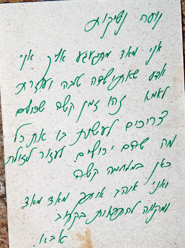 "במלחמות, כלום. אפילו גלויה לא היה שולח", אומרת בינה בחיוך של השלמה, אבל נעה נזכרת בגלויות שאביה דווקא כן שלח, ממלחמת שלום הגליל. "ניצן נולדה ביום הראשון של מלחמת של"ג, ב־6 ביוני 1982, בבוקר כשהם חצו את הגבול", מספרת נעה מציגה את המזכרת ההיסטורית מאביה. על גלויית בריסטול דקה שמצידה האחד סמל צה"ל ובצידה השני כתב מאיר לבתו משדה הקרב בעט ירוק: "אני מאוד מתגעגע אלייך. אני יודע שאת ילדה טובה ועוזרת לאמא. זהו זמן קשה שכולם צריכים לעשות בו את כל מהם שהם יכולים לעזור לזולת. כאן במלחמה קשה ואני אוהב אותך מאוד מאוד ומקווה להתראות בקרוב, אבא". היא מקריאה בקול רועד מהתרגשות.