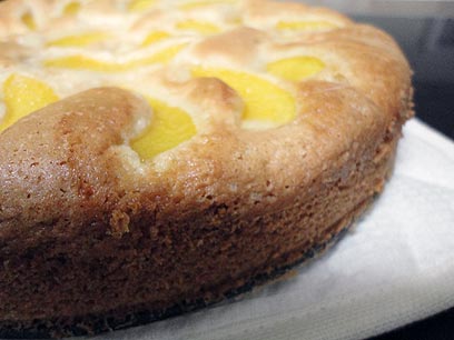 - יוצקים את התערובת לתוך התבנית ומשקעים את פלחי האפרסקים בתוך הבלילה.