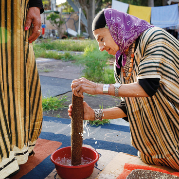 כאן תצאו למסע הקולינרי המרתק ביותר מכולם, למחוזות לא מוכרים בכלל של קולינריה, תרבות ומסורת. בפרויקט שימור מרגש ומעמיק שמובילה אפרת אליאסף־גורפינקל, חוקרת ויזמית קולינריה מטעם המועצה האזורית חבל מודיעין. טובה הלל ושמש אפרתי, מוותיקות המושב, מובילות את המבקרים לחזות בתהליך הכנת האוכל, עוד בטרם תתחיל הארוחה. ביציאה האחורית של המטבח המבהיק בניקיונו פוגשים כוך מאולתר, מעין צריף בנוי לוחות פח שמשמש כמטבח האמיתי. על מדורה שבוערת במרכזו מונח לוח פח עגול, ובטכניקה מיוחדת, המשלבת בצק ואבנים לוהטות, הן יוצרות את החוזגה – פיתה עבה, עם קרום מתפצפץ וליבה רך ועסיסי. שם הן גם מכינות את הלחח החבאני, שמזכיר את הלחוח אבל בניגוד אליו עשוי מתערובת דלילה שנקראת ראי ועשויה מסולת, בצל קלוי מתובל ודורה. בתוך ה"מיפה", מעין טאבון שעשוי מדוד ברזל עטוף בטון, צולים על חום שיירי בשר וירקות שמקבלים טעם חרוך נפלא אחרי ששהו בו מספר שעות ויוגשו לצד לאסיס – תבשיל קטניות. וכמובן יוגשו מרק עשיר בנתחי בשר ובתפוחי אדמה לצד מטבלים מסורתיים.