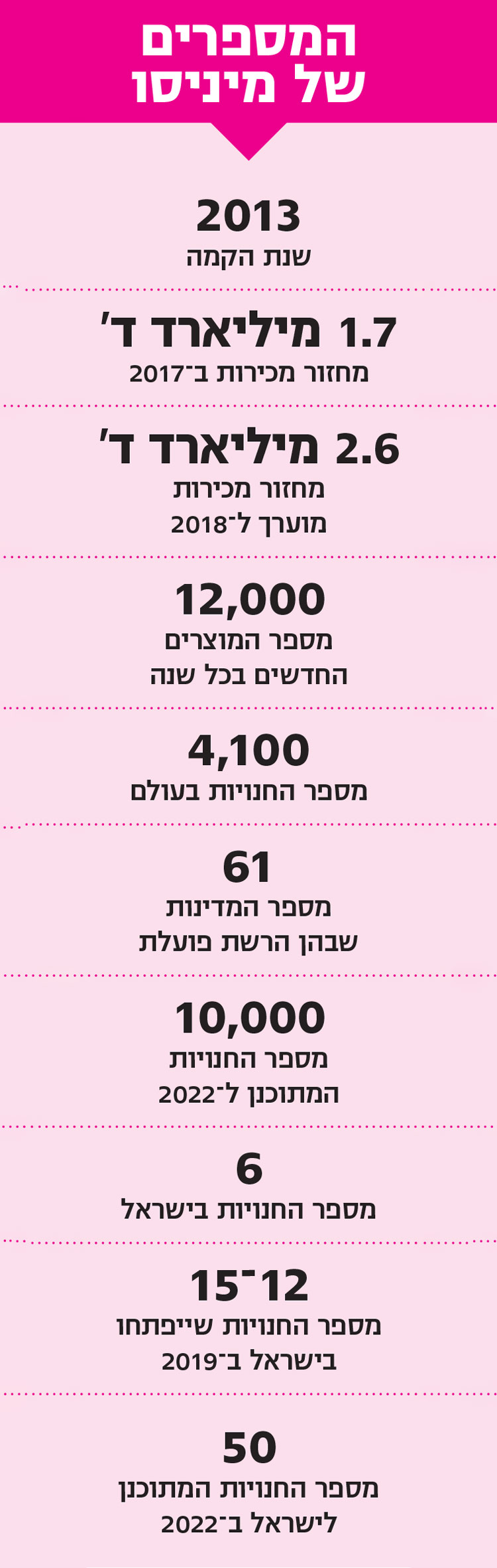 וכך, אם ל־H&M לקח 64 שנים להגיע ל־70 מדינות, וליוניקלו לקח 17 שנים להגיע ל־43 מדינות, מיניסו הגיעה ל־61 מדינות בחמש שנים (איקאה הגדולה, אגב, פועלת ב־30 מדינות בלבד). כבר בשנה הראשונה לקיומה, 2013, נפתחו 300 חנויות, ובתוך חמש שנים צמחה ל־4,100. הזכיינים מוחתמים על חוזים דרקוניים המכתיבים קצב פתיחת חנויות היסטרי, ובכל חודש נפתחים 80־100 סניפים בעולם. "עד 2022 יהיו לנו 10,000 סניפים ב־100 מדינות ומחזור של 15 מיליארד דולר", אומר מיאקה בחיוך נון־שלנטי.
