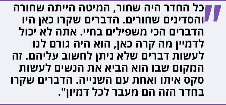 "ניסיתי, הראיתי לו שלא נוח לי עם דברים מסוימים, אבל הוא אמר, 'אני לא רואה שלבנות האחרות יש בעיות עם זה, אז אם את אוהבת את דדי, כמו שאת אומרת שאת אוהבת אותו - אני לא רואה מה הבעיה'. הוא שיכנע אותך שאת בעייתית ושאין שום דבר רע במה שאנחנו עושים, כי לכל האחרות זה לא מפריע".