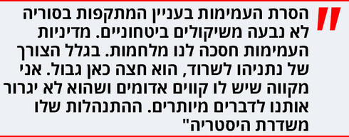 "הסרת העמימות בעניין המתקפות בסוריה לא נבעה משיקולים ביטחוניים, אלא מהמצוקה של נתניהו. מהשנים שהייתי בפיקוד העורף אני יודע שמדיניות העמימות חסכה לנו מלחמות. כי בזכותה המנהיגים שמעבר לגבול יכלו להכיל את מה שקרה. יש הרבה מאוד אגו בתוך העניין הזה, אבל בגלל הצורך של נתניהו לשרוד, הוא חצה כאן גבול. אני מקווה שיש לו קווים אדומים ושהוא לא יגרור אותנו לדברים מיותרים".