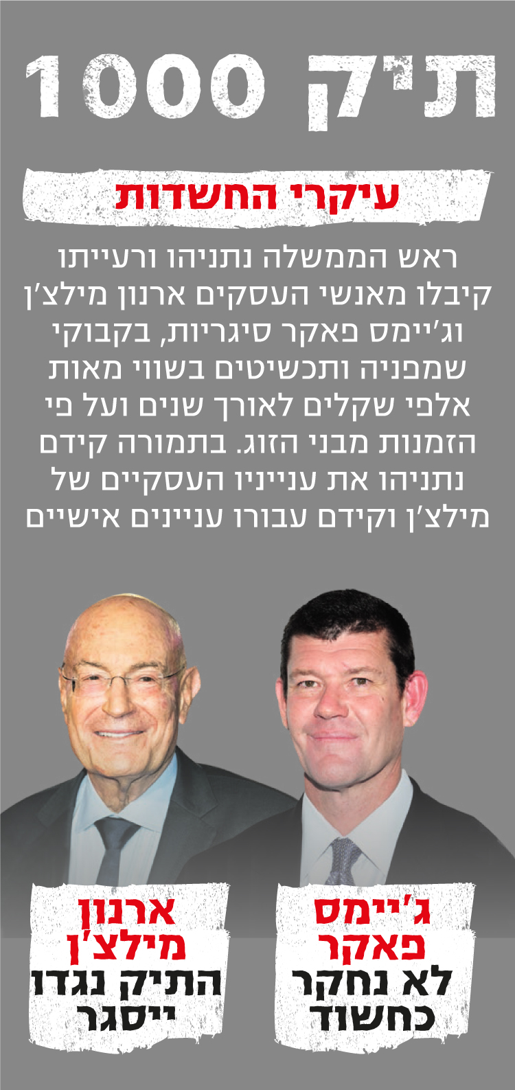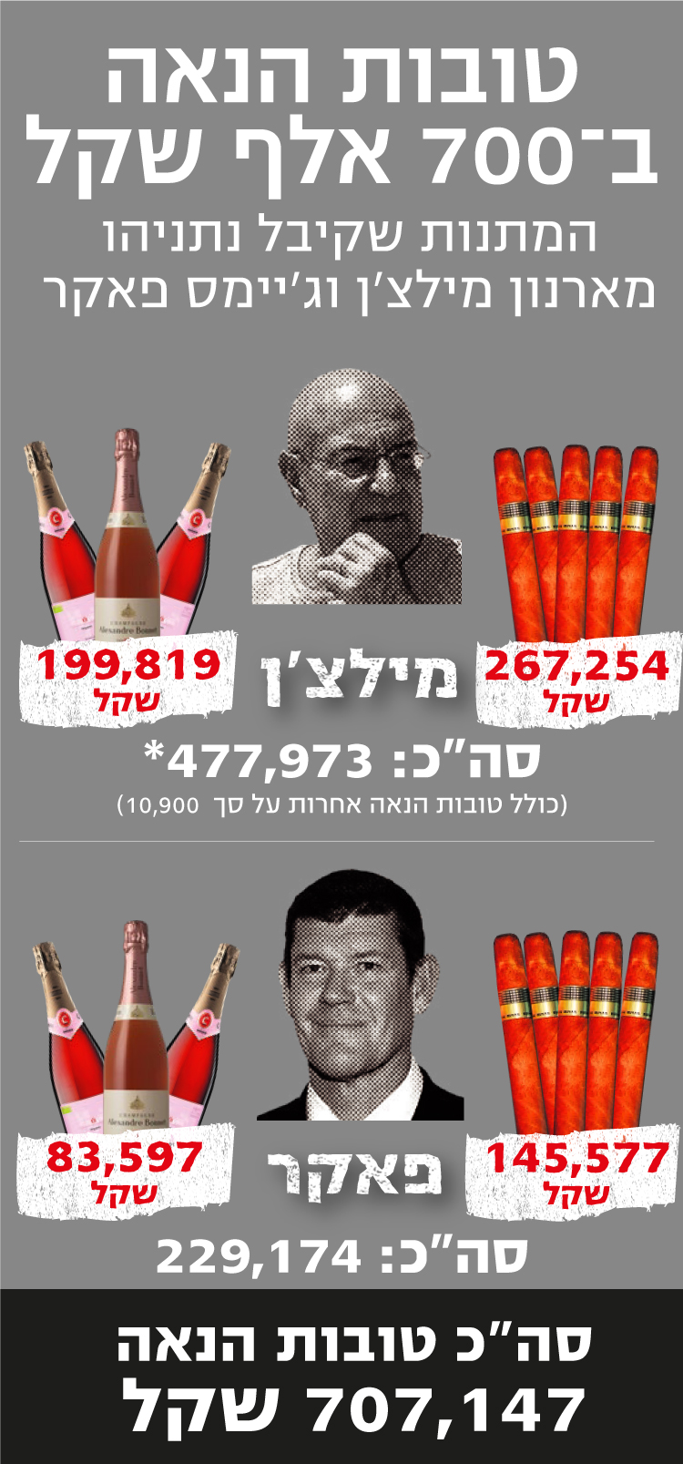 "מאז 1999 אתה מקיים עם מילצ'ן קשר שהעמיד אותך בניגוד עניינים חריף ומתמשך... לצד מערכת היחסים האישית שהתקיימה ביניכם, קיבלת טובות הנאה שונות, לעיתים כמענה לבקשתך, שעיקרן אספקת טובין באופן רציף ובהיקף כספי ניכר": על פי כתב החשדות שהעביר אתמול היועץ המשפטי לממשלה, נתניהו מואשם במרמה ובהפרת אמונים בגין טובות הנאה בשווי מאות אלפי שקלים שקיבל מארנון מילצ'ן ומג'יימס פאקר, וכללו סיגרים, שמפניות ותכשיטים. התיק נגד מילצ'ן נסגר.
