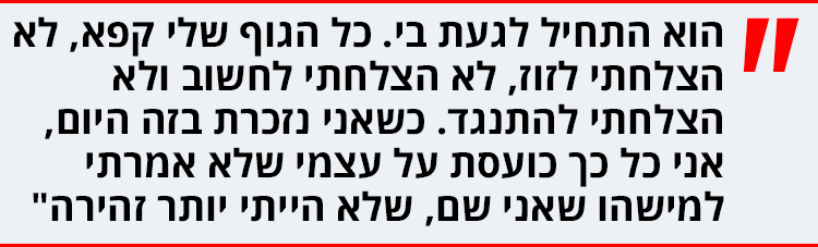 "הדבר הבא שאני זוכרת אחרי הלילה הזה הוא שאני מתעוררת בהלם בבוקר. הרגשתי כל כך רע פיזית ונפשית, שאלתי אותו מה קרה אתמול בלילה והוא אמר שכלום, שלא עמד לו בגלל הסמים. 'רק עשיתי לך נעים', הוא אמר. בשורה התחתונה, הוא עשה עם הגוף שלי דברים שלא רציתי שיעשה, בצורה כל כך חלאתית ונבזית. אני אפילו לא יודעת מה אמת ומה שקר. זה היה אחד הרגעים הכי נוראים בחיים שלי. הוא המשיך לשחק אותה קול, אפילו הציע שנלך לאכול חומוס.