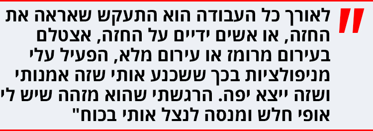 "קבענו להיפגש אצלו, ברחוב העלייה בדרום תל אביב. חשבתי שאני אגיע למשרד שלו, אבל זו הייתה דירה רגילה. ישבנו, דיברנו ושתינו קצת יין. הייתה לו מנטליות של איש מכירות, בכל פעם שהתעורר אצלי ספק הוא מיד דאג להעלים אותו. הוא הראה לי תמונות של דוגמניות שהוא שלח לפרויקטים ברחבי העולם. באמצע הפגישה שלנו הוא קיבל שיחה, אמר שאנחנו צריכים לסיים ולקבוע להיפגש בהזדמנות אחרת. בפעם השנייה כבר לא כל כך חששתי להגיע אליו. גם לא חששתי לשתות עוד קצת אלכוהול ולנסות ליהנות במחיצתו. הוא הרגיש בכך וביקש לנסות לצלם אותי, זרמתי.