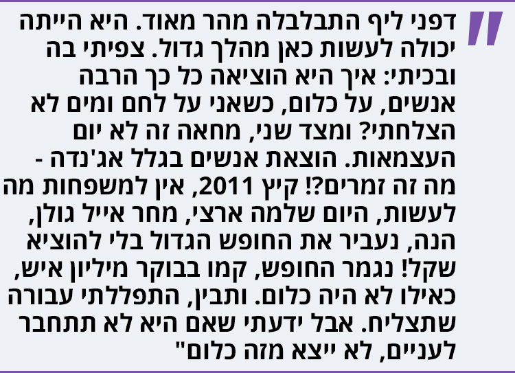 "דפני התבלבלה מהר מאוד. היא הייתה יכולה לעשות כאן מהלך גדול. צפיתי בה ובכיתי: איך היא הוציאה כל כך הרבה אנשים, על כלום, כשאני על לחם ומים לא הצלחתי? ומצד שני, מחאה זה לא יום העצמאות. הוצאת אנשים בגלל אג'נדה - מה זה זמרים?! קיץ 2011, אין למשפחות מה לעשות, היום שלמה ארצי, מחר אייל גולן, הנה, נעביר את החופש הגדול בלי להוציא שקל! נגמר החופש, קמו בבוקר מיליון איש, כאילו לא היה כלום. ותבין, התפללתי עבורה שתצליח. אבל ידעתי שאם היא לא תתחבר לעניים, לא ייצא מזה כלום. ובדיעבד, הרבה אנשים מהדרום אמרו לי, לא קיבלנו שם במה. זו הטעות האסטרטגית.