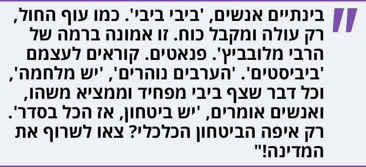 "אבל בינתיים אנשים, 'ביבי ביבי'. כמו עוף החול, רק עולה ומקבל כוח. זו אמונה ברמה של הרבי מלובביץ'. פנאטים. קוראים לעצמם 'ביביסטים'. 'הערבים נוהרים', 'יש מלחמה', וכל דבר שצף ביבי מפחיד וממציא משהו, ואנשים אומרים, 'יש ביטחון, אז הכל בסדר'. רק איפה הביטחון הכלכלי? צאו לשרוף את המדינה!"