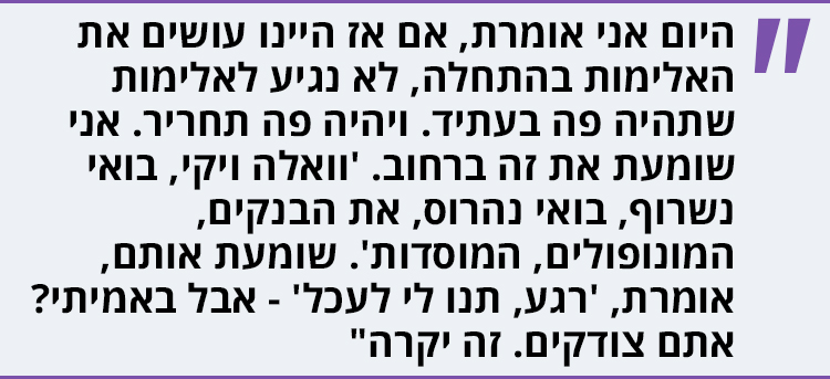 "נכון. וזו הייתה טעות. היום אני אומרת, אם אז היינו עושים את האלימות בהתחלה, לא נגיע לאלימות שתהיה פה בעתיד. ויהיה פה תחריר. אני שומעת את זה ברחוב. 'וואלה ויקי, בואי נשרוף, בואי נהרוס, את הבנקים, המונופולים, המוסדות'. שומעת אותם, אומרת, 'רגע, תנו לי לעכל' - אבל באמיתי? אתם צודקים. זה יקרה".