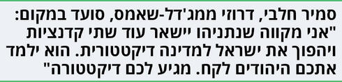 סמיר חלבי הוא דרוזי שנולד בדלית אל-כרמל ומתגורר היום במג'דל שאמס. "אצל גֶנֶץ ברשימה יש את מי שניסח את חוק הלאום" (צבי האוזר — א"א), הוא אומר. אני מבהיר לו שאת שמו של הרמטכ"ל לשעבר מבטאים אחרת, אבל הוא מסרב להשתכנע. "אני אומר גֶנֶץ", הוא אומר.