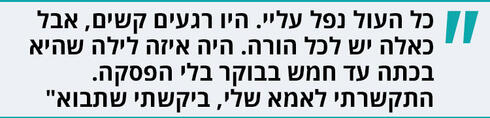 "אני מפרנסת יחידה. קמה בלילה לבד, מחליפה טיטולים לבד. כל העול נפל עליי. היו רגעים קשים, אבל כאלה יש לכל הורה. היה איזה לילה שהיא בכתה עד חמש בבוקר בלי הפסקה. התקשרתי לאמא שלי, ביקשתי שתבוא. מניחה שאלה צרות של כל אמא".