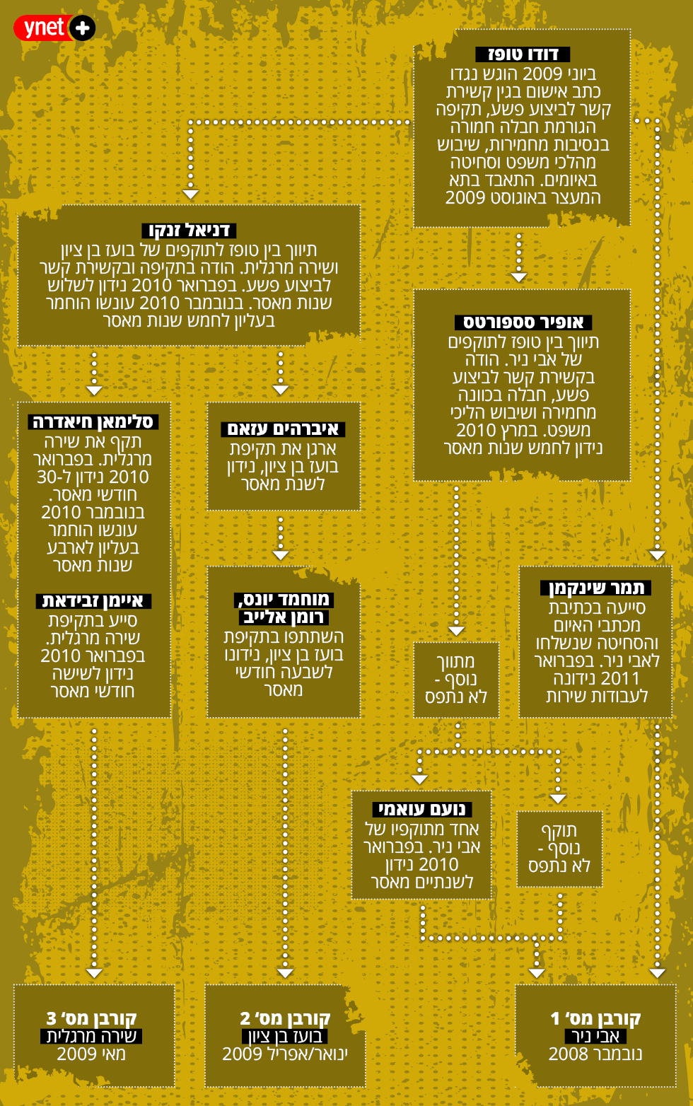 במכתב האחרון שלו מתא המעצר, טופז סיפר לאחיו שפגישה בין עורך הדין שלו לפרקליטות נקבעה לתחילת ספטמבר. המטרה: גיבוש עסקת טיעון. הפגישה הזו לא יצאה לפועל - טופז התאבד שבועיים קודם לכן - אבל רף הענישה של התוקפים ושל דרג הביניים מבהיר לאן כיוונו הרשויות: מספר דו-ספרתי של שנים מאחורי סורג ובריח.