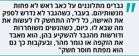"הם יכולים לצחוק, אבל בזוגיות ארוכה, גברים מתלוננים על כאב ראש לא פחות מנשותיהם. בעבר, כשהגבר לא נדרש לספק את האישה, כל לילה התחשק לו לעשות את מה שבא לו. כיום, כשהנשים משוחררות, עובדות, מנהלות את הבית ודורשות מהגבר להשקיע בהן, הוא מאבד את הזקפה או גומר מהר, ובעקבות כך גם הוא מפתח חוסר חשק. אחד האתגרים של זוגיות ארוכה היא לשמור על חשק הדדי, וזה לא קל. הממוצע הישראלי הוא פעמיים בשבוע. כשיש ילדים קטנים זה קצת פחות, ודווקא אחרי גיל 50 יש פריחה, בתנאי ששמרנו על הגוף שלנו. אצל גברים הדחף המיני קיים עד 120, גם כשהטסטוסטרון בנסיגה. נשים אמורות לראות בגלי החום סימן לכך שעליהן להתחיל להשתמש בהורמונים כדי שהמיניות לא תאבד".