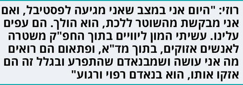 "אני חושבת שהם ראו את העבודה שלנו והם באמת סומכים עלינו. עשיתי המון ליוויים בתוך החפ"ק משטרה לאנשים אזוקים, בתוך מד"א, ופתאום הם רואים מה אני עושה ושמבנאדם שהתפרע ובגלל זה הם אזקו אותו, הוא בנאדם רפוי ורגוע ומתקשר אחרי שעתיים שאני יושבת איתו. מה הם יכולים להגיד?"