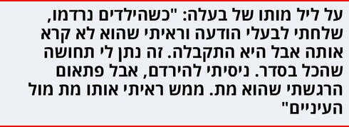 בערב השכיבה כרגיל את הילדים במיטתם. "הם רצו לישון לידי, אבל אני ביקשתי מהם שלא, לא הרגשתי טוב. אני זוכרת שאמרתי לילדים, 'אני מרגישה שכבד לי, אני צריכה לישון במיטה שלי לבד'. וכשהם נרדמו במיטותיהם, שלחתי לבעלי הודעה וראיתי שהוא לא קרא אותה, אבל היא התקבלה. זה נתן לי תחושה שהכל בסדר. ניסיתי להירדם, אבל פתאום הרגשתי שהוא מת. ממש ראיתי אותו מת מול העיניים, וראיתי את עצמי מספרת לילדים על מותו. היום אני יודעת שזה היה בדיוק ברגע שיצאה נשמתו, ואני בטוחה שכשזה קרה, הוא נפרד ממני ונתן לי כלים לספר לילדים.